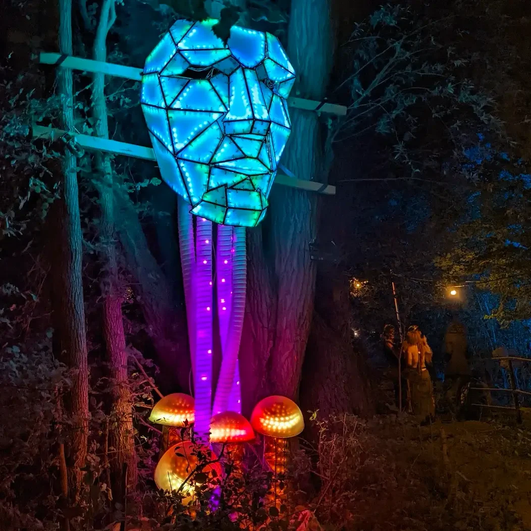 Over the years I have built people tracking articulated eyes balls, sound reactive illuminated animals, spray painting art robots & interactive & immersive rooms for theme parks. I even ended up being featured on BBC’s Country File for my work with Tyntsefield Estate (https://www.bbc.co.uk/programmes/m000crs9). I found that music festivals felt like home & a playground for creative tech, & whilst I was working full time at Bristol Robotics Laboratory, I was spending my spare time using robotics tech & skills to build interactive & immersive experiences for festivals.