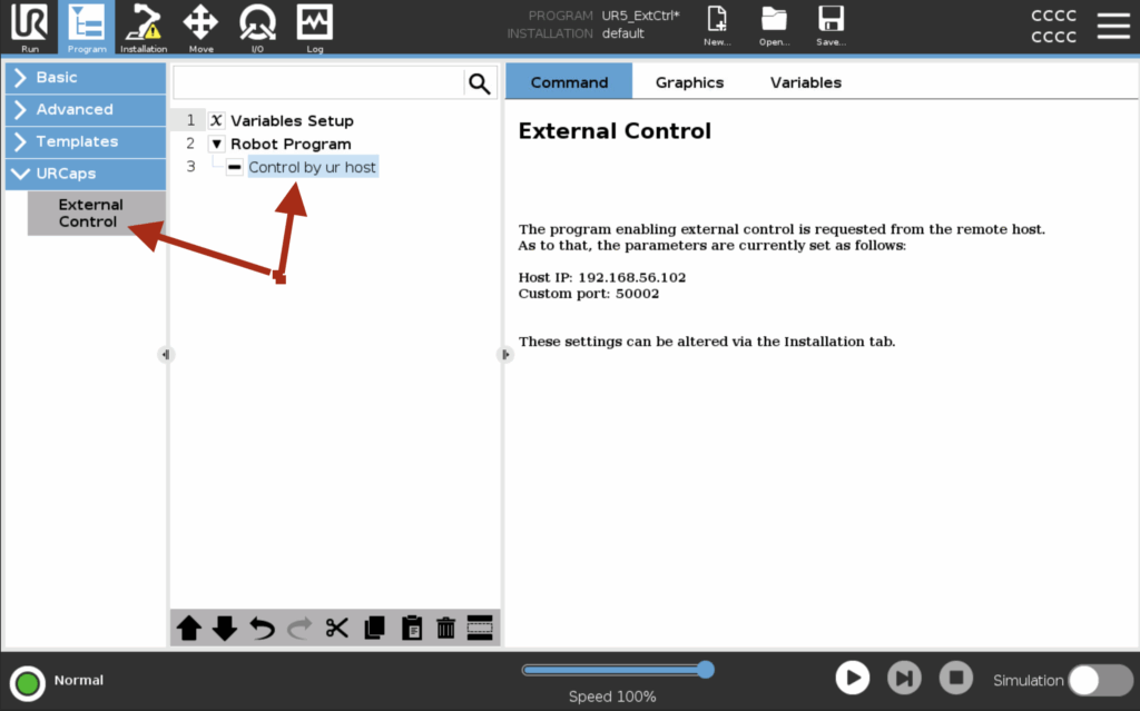 A final step is to create a new program on the robot that uses urcaps. In the new program you need to add the external control by clicking on ur caps/external control on the left.