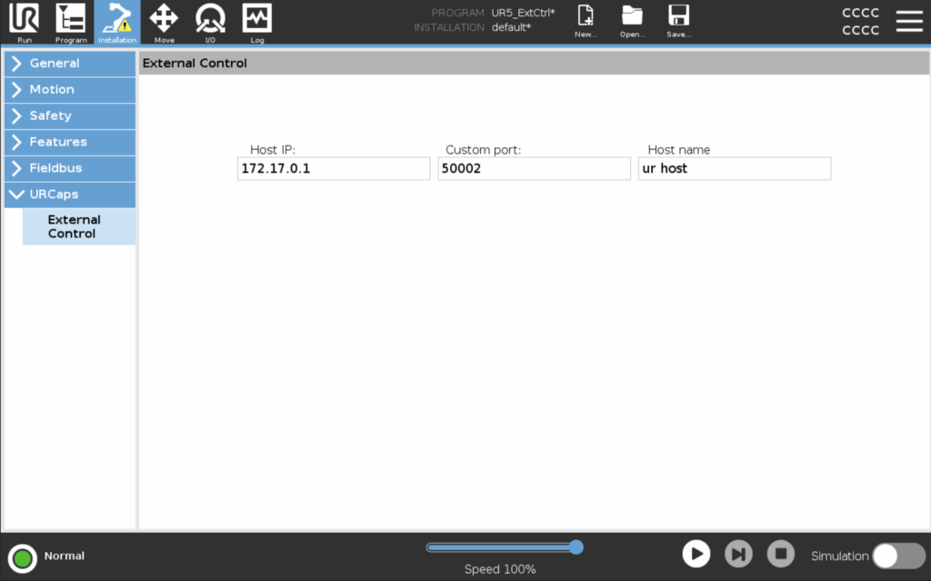 Next you need to configure the IP for urcaps in the installation tab. The host ip should be the ip of the ur_robot_driver instance. If you run ursim through docker, and ur_robot_driver on the host, the ip will be 172.17.0.1