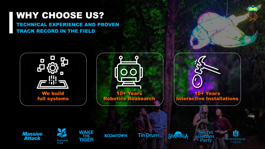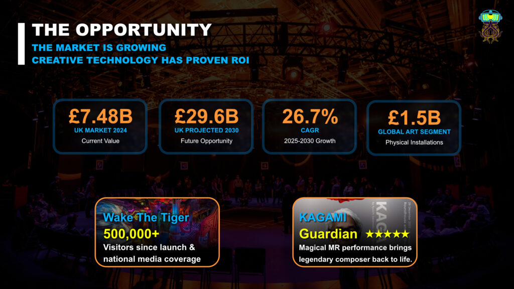 The Pitch (Simplified): I hooked the room describing how I was at the Arnolfini in Bristol setting up for the SuperToys exhibition, hearing Bjork on repeat whilst I should have been at my graduation for my robotics BSc. Perhaps a social faux pas, but it felt right to be using my tech in creative ways back in 2008 just like it does in 2026. Now, post pandemic, audiences are bored and want shared, tangible, substantive memories.